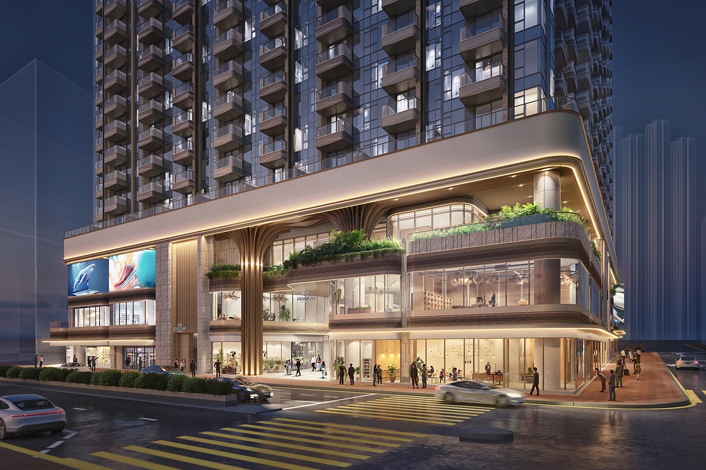 基座設有兩層大型商場及步行街,佔地逾60,000平方呎